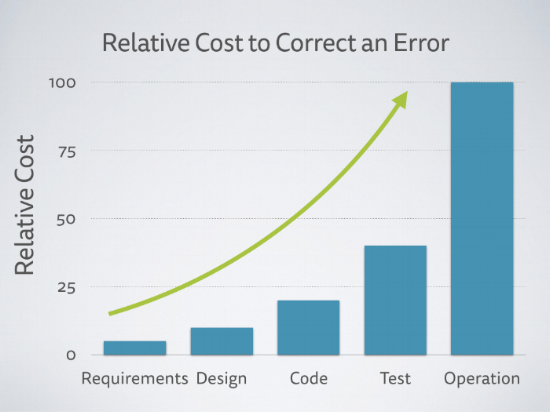 Why is planning so important? Problems get more expensive to solve when they are discovered later in the process, as this graph shows: